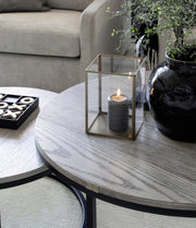 Antikkgrått. Eikefiner / MDF. Svart jernbunn.
