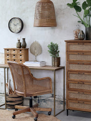 Tilfør kontoret ditt et snev av fransk sjarm med denne vakre kontorstolen i klassisk design. Med sete og ryggstøtte i fransk rotting kombinerer kontorstolen estetikk og komfort på en stilig måte. Den varme trerammen og elegante, antikke jernhjul fullfører det autentiske vintage-utseendet som passer perfekt inn i både moderne og klassisk interiør.